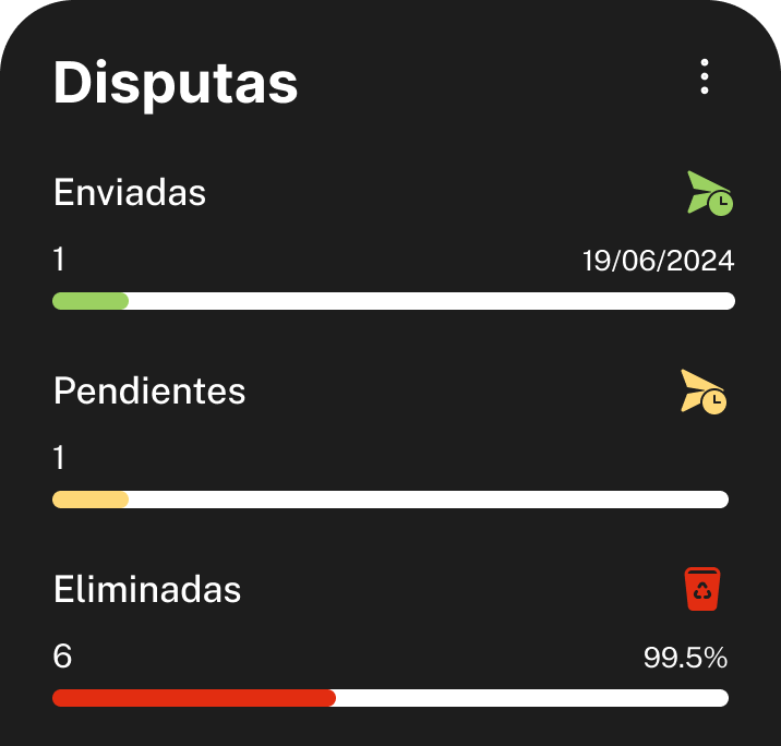 Inicia disputas de errores en tu reporte de crédito con un solo clic, detecta inconsistencias rápidamente y haz seguimiento al progreso y resultados de cada disputa.